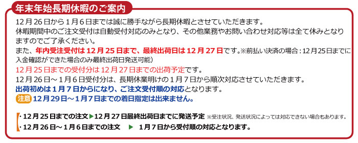 - 【年内注文受付:12/25まで】12月27日~1月6日まで年末年始休業