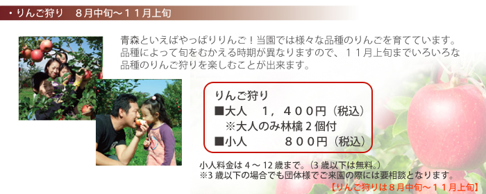 ※りんご狩りは時期によって収穫できるりんごの種類が異なります。(露地栽培のため雨天時中止)