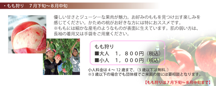 ※桃狩りは成育状況により開催しない場合もございます。(露地栽培のため雨天時中止)