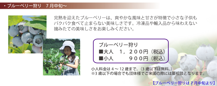 ※ブルーベリー収穫時は真夏のため各自での熱中症対策をお願いします。(露地栽培のため雨天時中止)